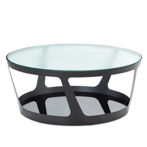 The Arys Coffee Table is a spectacular tapered barrel base supporting a top of fused glass. This top features a grid pattern melted into the glass giving it rich texture and depth. The circular lower shelf of gloss black glass provides an ample storage area. Available in all Elite powder-coat finishes. Companion end table also available.