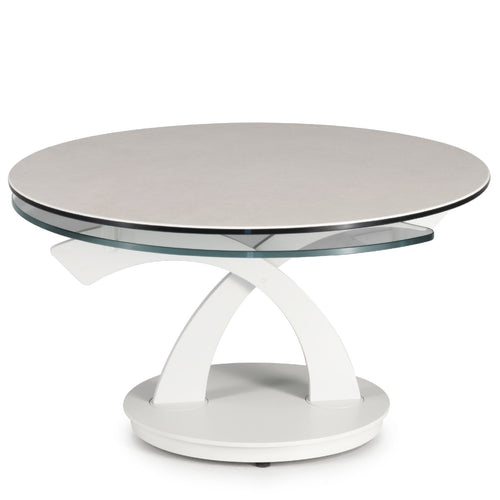 The Foli Coffee Table is an extensible cocktail table with synchronized revolving tops in glass or ceramic selections. Base and supports in painted finishes. The base is equipped with a mechanism for the synchronized rotation of the tops that allow ample modulation of the shape. Made in Italy.