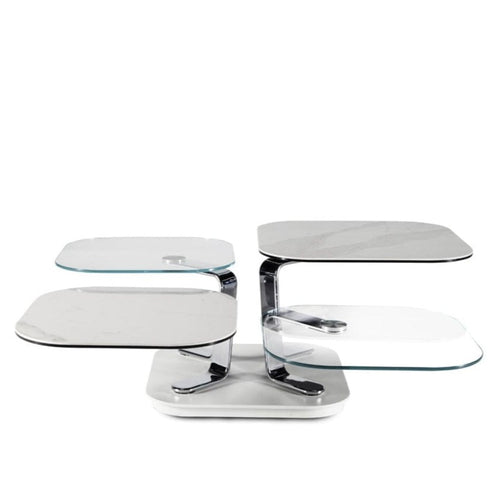 Extendable Table with 4 tops in crystal or ceramic. Equipped with an innovative double synchronized opening mechanism that allows the 4 tops to open with a single gesture but in opposite directions. Painted or chromed steel supports. Made in Italy.